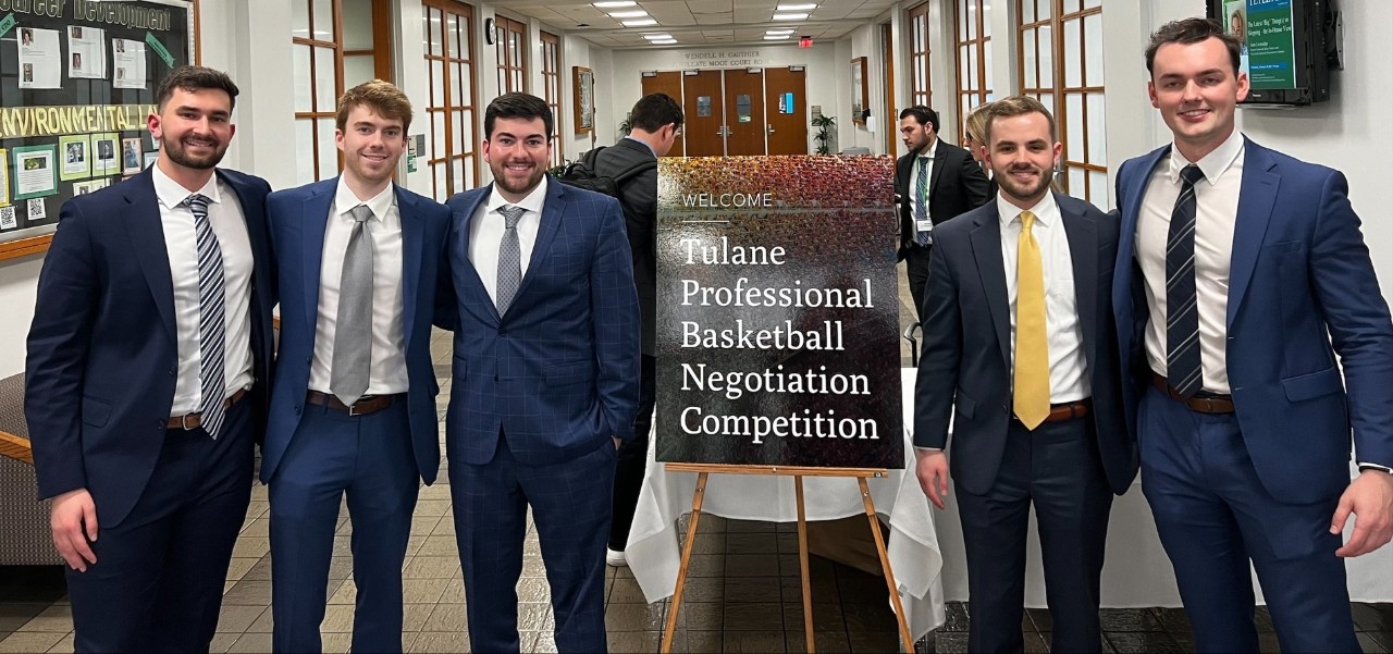Villanova Law had two teams participate in the Sixth Annual Tulane Pro Basketball Negotiation Competition from February 23-24. Competing against 44 teams from across the country, Dante Camilli ’23, Sid Green ‘24 and Ross Sutton ’23 finished in fifth place after going undefeated in their negotiations rounds and narrowly missing a championship bid. In addition, the team of Hunter Parsons ’24 and James McCauley ’24 also captured a top-ten finish.